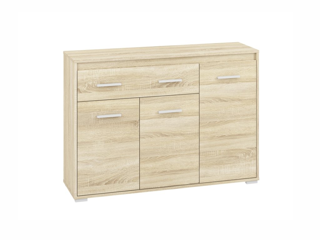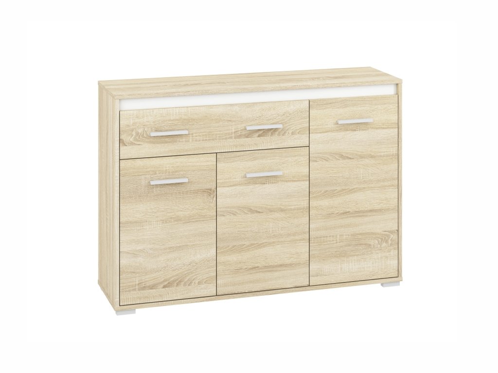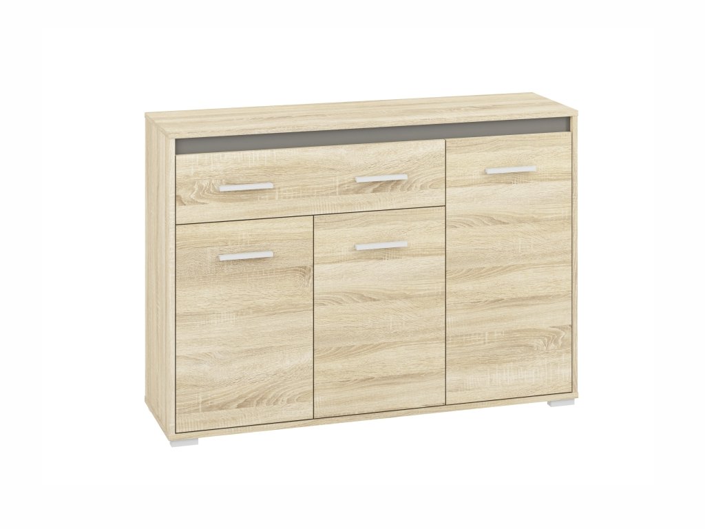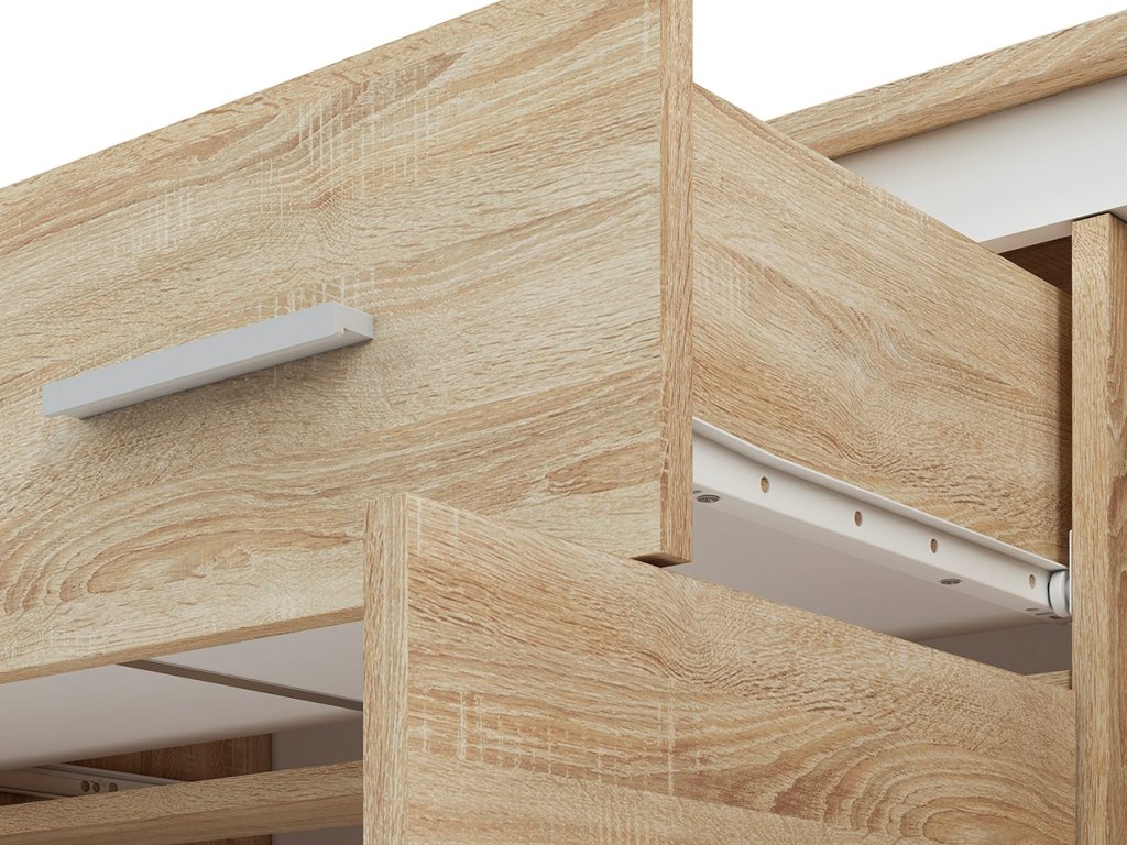Konstrukce je vyrobena z kvalitního a odolného lamina v dekoru dřeva, úchytky jsou vyrobeny z plastu ve stříbrné barvě. Součástí balení jsou 3 dekorační lišty v barvě antracit, bílá a dub sonoma, které umožňují vybrat si konečný vzhled komody (viz. přidružené obrázky). Lišty je možné kdykoliv měnit.