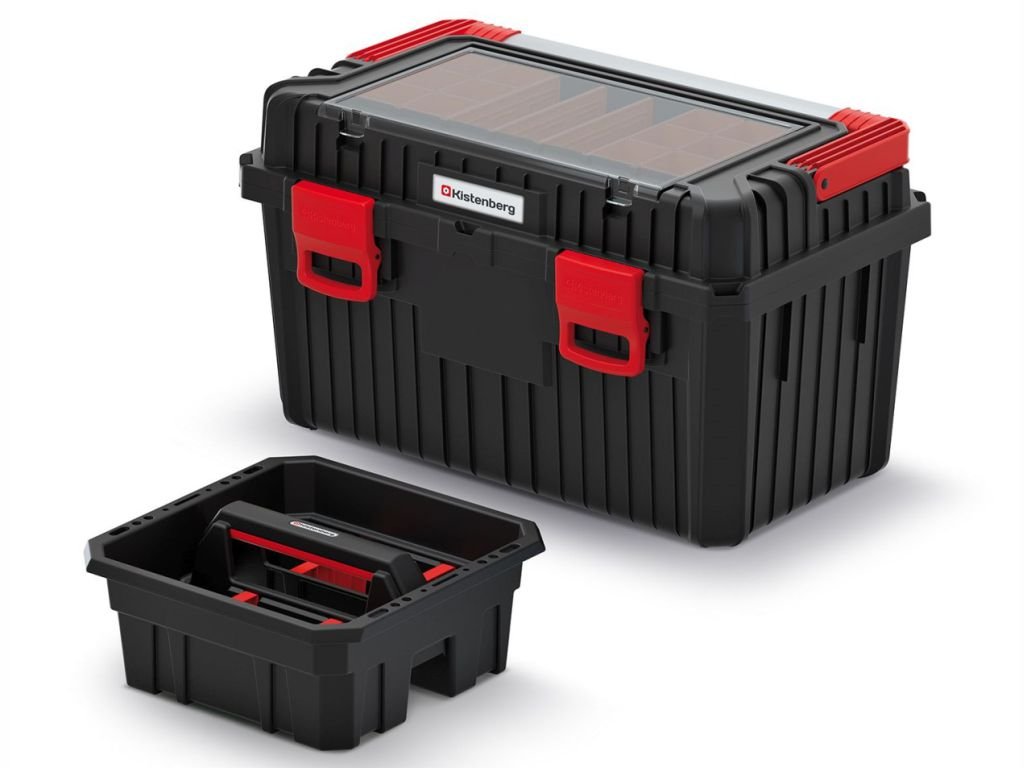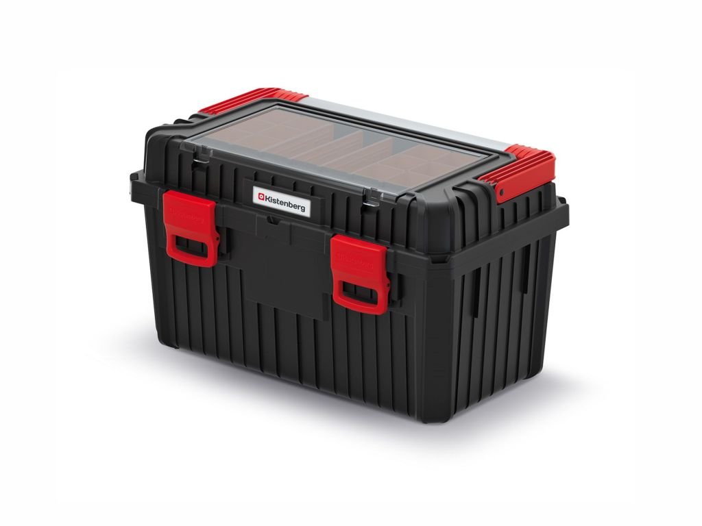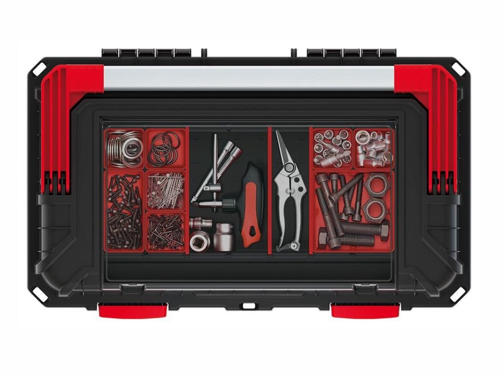Kufr je vybaven těsněním, které odolá prachu a vodě, a je ideálním společníkem při skladování a přenášení těžkého nářadí. Tělo je vyrobené ze směsi vysoce pevných polymerů. Ergonomická rukojeť a spony jsou z ABS. Součástí víka je průhledný organizér.