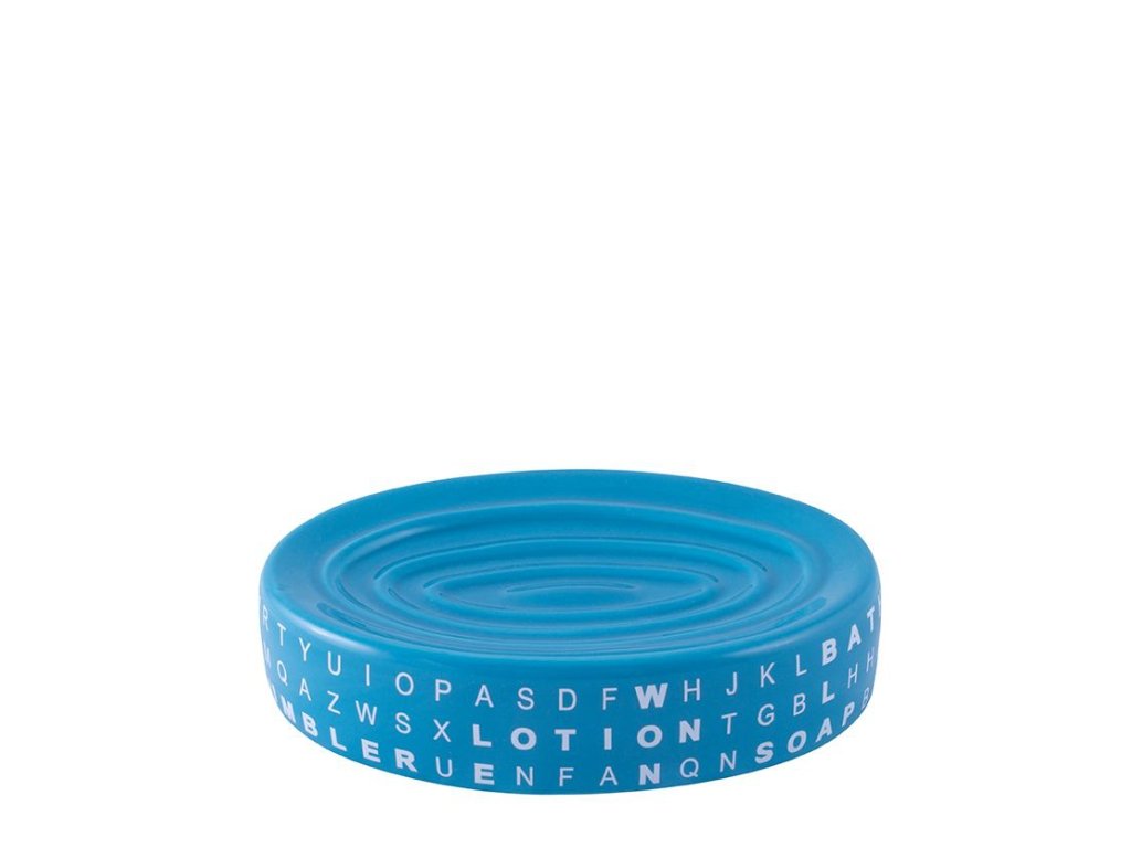 Moderní mýdlenka ENZO je vyrobena z keramiky v modré barvě s bílým potiskem.