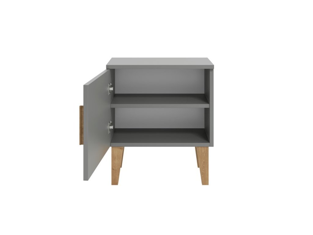 Konstrukce a přední díly jsou vyrobeny z kvalitního a odolného lamina v matné šedé barvě. Nožky a úchytka jsou z masivního dubového dřeva.
