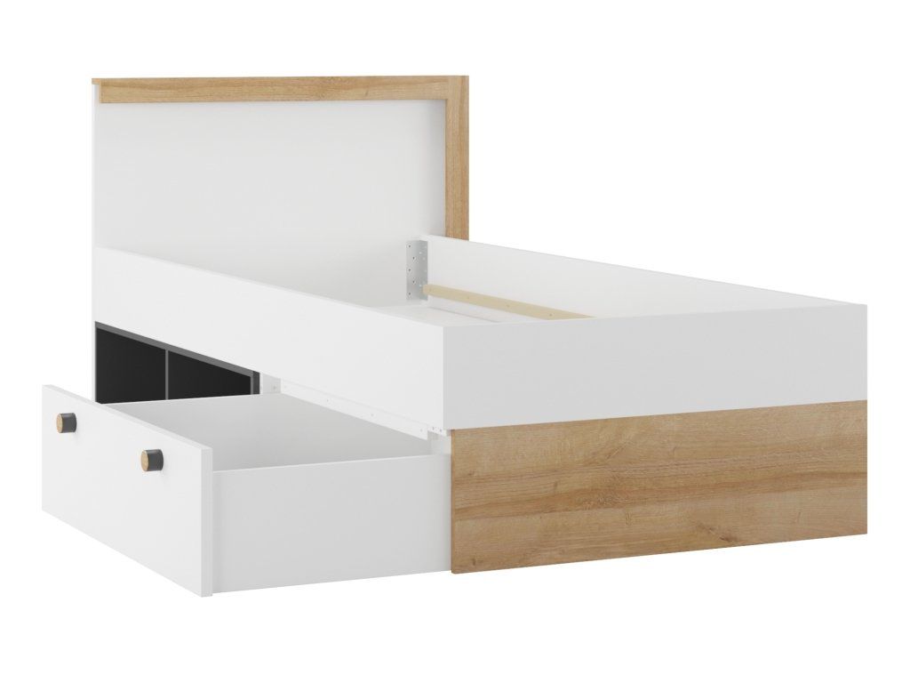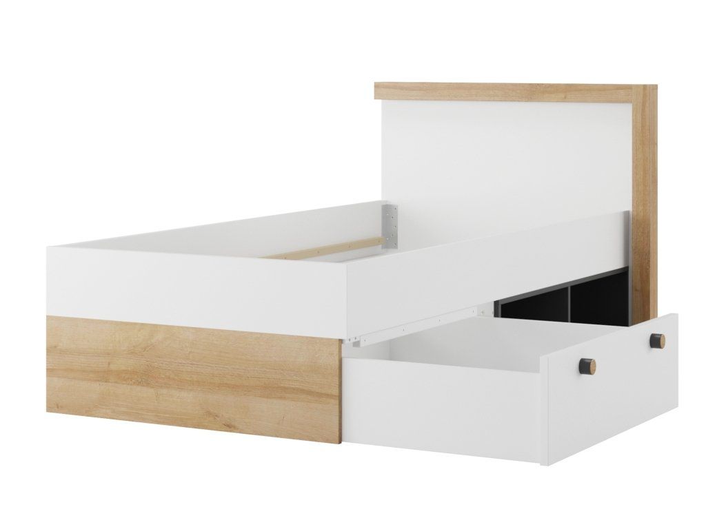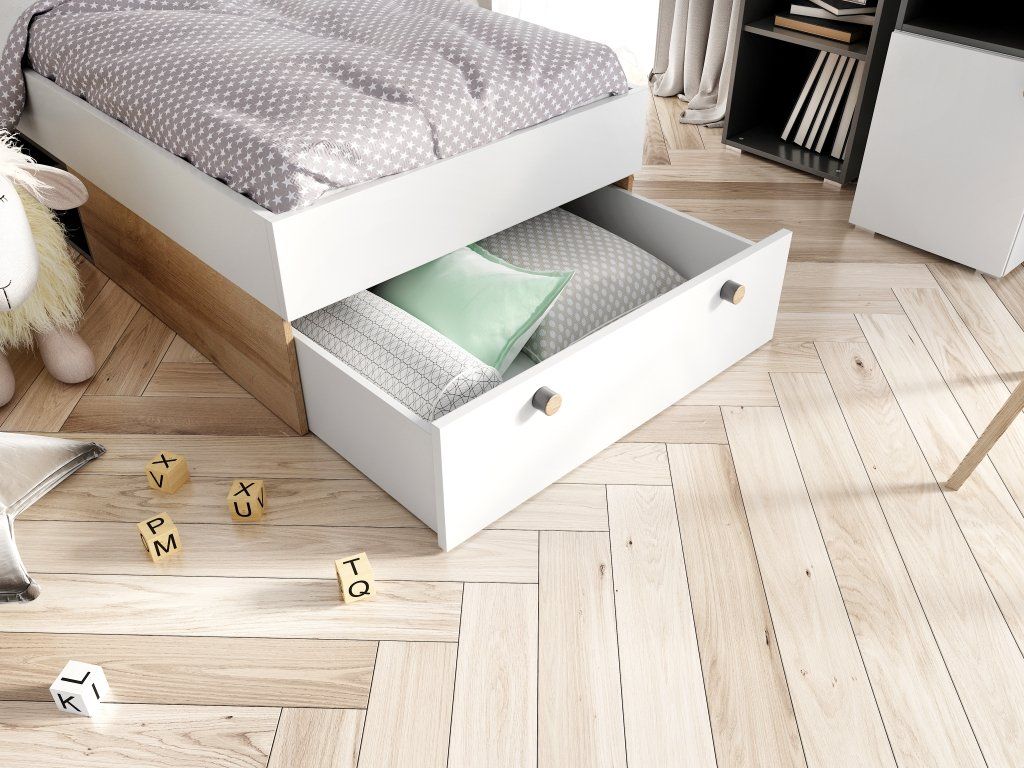 Při výrobě postele jsou použity pouze kvalitní materiály, které zaručují její perfektní vzhled, vysokou kvalitu a tím také životnost. Celá konstrukce je vyrobena z laminované dřevotřískové desky v dekoru dřeva v kombinaci s bílou a matnou černou barvou. Úchytky jsou kulaté dřevěné, nožky plastové ve stříbrné barvě. Postel má 1 zásuvku, kterou podle vašeho přání lze namontovat na 3 různé strany (viz. přidružené obrázky).