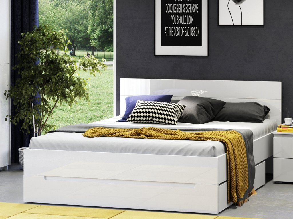Postel je vyrobena z kvalitních materiálů, které zaručují její perfektní vzhled, vysokou kvalitu a tím také životnost. Konstrukce je vyrobena v kombinaci desky MDF v lesklé bílé barvě a laminované dřevotřískové desky v matné bílé barvě, nožky jsou plastové ve stříbrné barvě.
