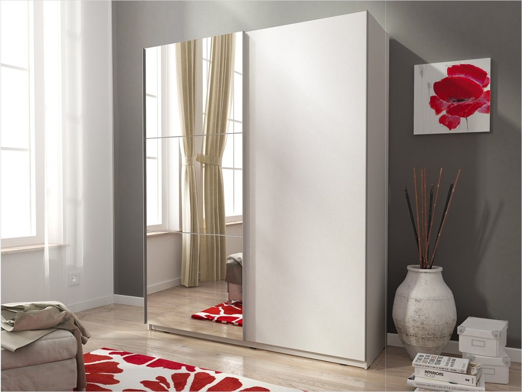 Velká šatní skříň MIKA 2/150 s posuvnými dveřmi a zrcadlem nabízí díky své velikosti více úložného prostoru než běžné šatní skříně. Lze ji použít samostatně nebo k jakémukoliv nábytku ve stejném dekoru. Konstrukce je vyrobena z kvalitního a odolného lamina v matné bílé barvě.