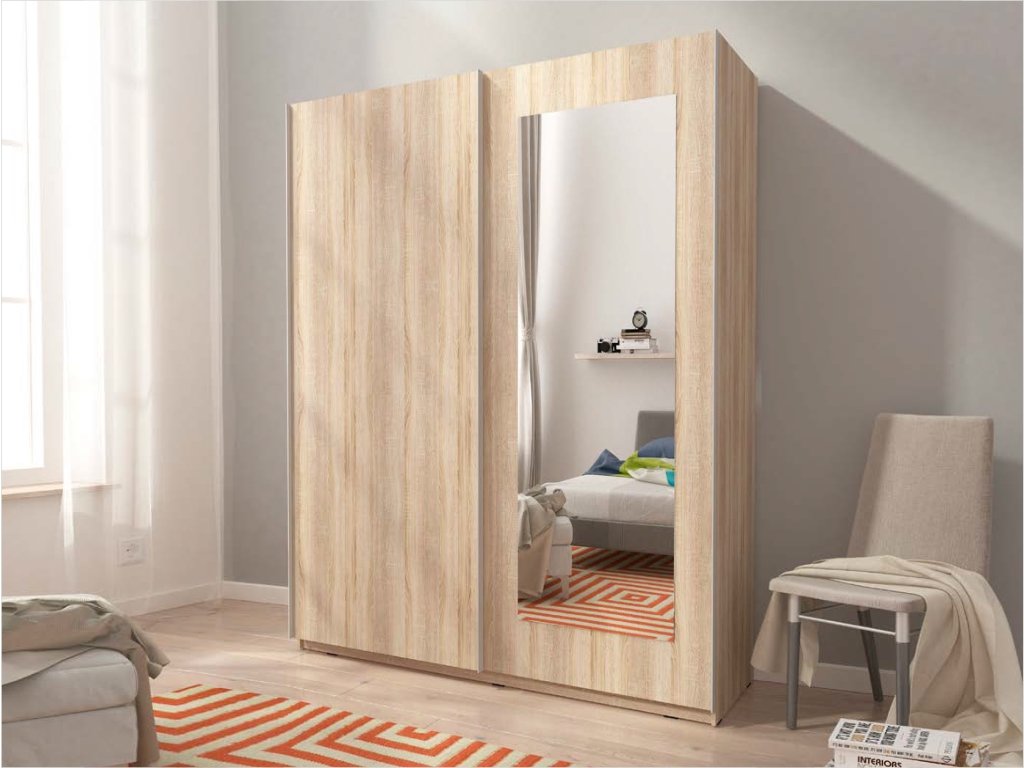 Velká šatní skříň MIKA 8/150 s posuvnými dveřmi a zrcadlem nabízí díky své velikosti více úložného prostoru než běžné šatní skříně. Lze ji použít samostatně nebo k jakémukoliv nábytku ve stejném dekoru. Konstrukce je vyrobena z kvalitního a odolného lamina v dekoru dřeva.