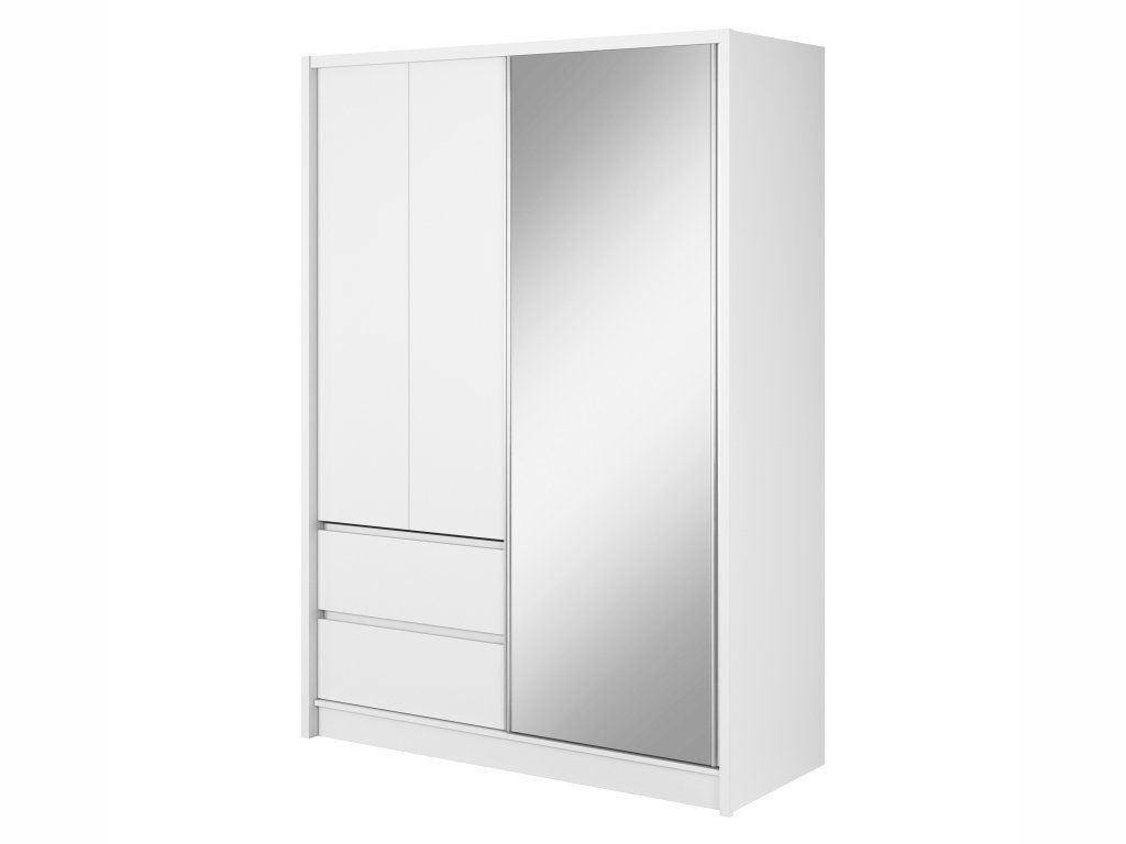 Velká šatní skříň SARA 150 s posuvnými dveřmi, zrcadlem a zásuvkami nabízí díky své velikosti více úložného prostoru než běžné šatní skříně. Lze ji použít samostatně nebo k jakémukoliv nábytku ve stejném dekoru. Konstrukce je vyrobena z kvalitního a odolného lamina v bílé barvě. Úchytky jsou hliníkové ve stříbrné barvě.
