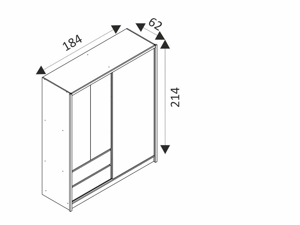 - šířka 184 cm, výška 214 cm, hloubka 62 cm.