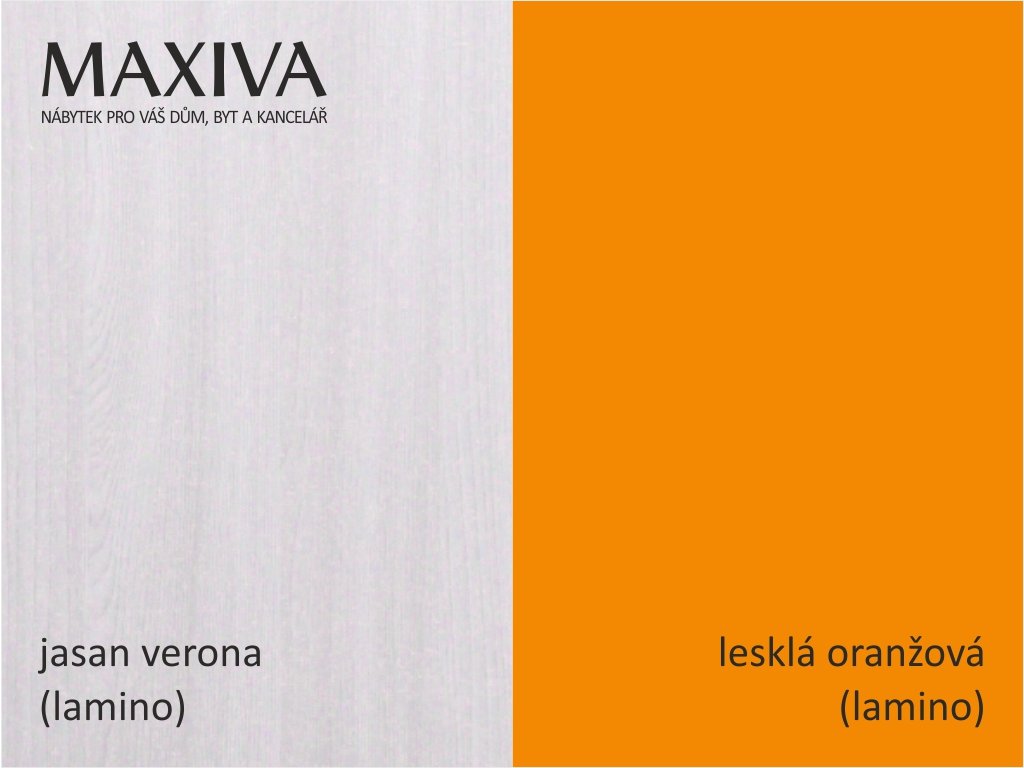 Konstrukce je vyrobena z kvalitního lamina v kombinaci dekoru dřeva a oranžové barvy. Nožky a úchytky jsou plastové ve stříbrné barvě.